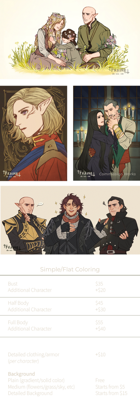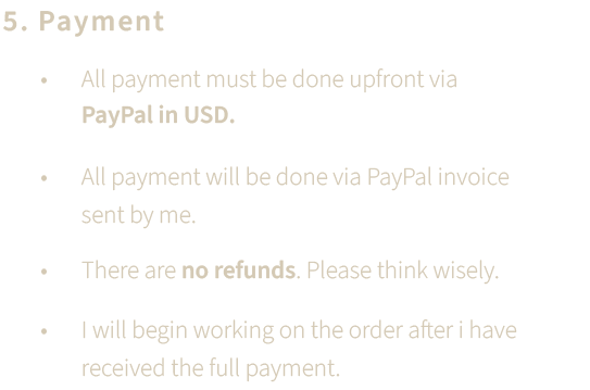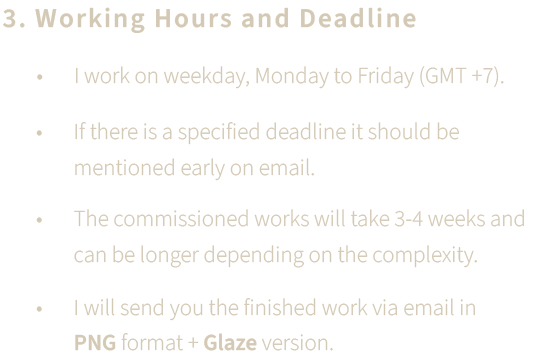 By commissioning me, the Client agrees to the following terms, please read carefully. Any Works that violated these terms will be canceled immediately. I have the right to decline any commission that I don’t feel comfortable or capable to work on.