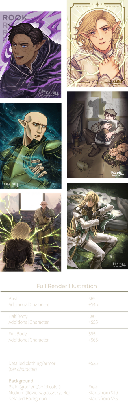 Email subject: Your name (Commission order) example: Kate (full render - half body - solid color bg).