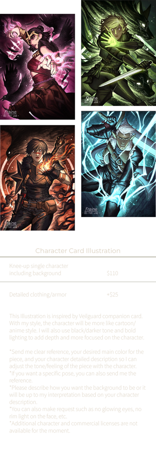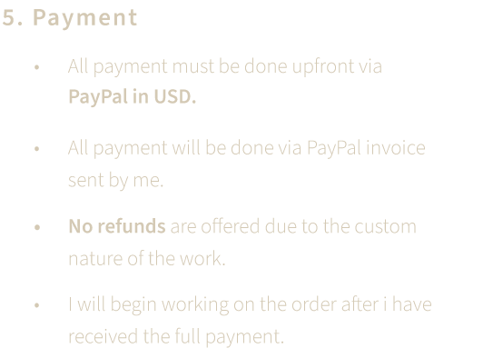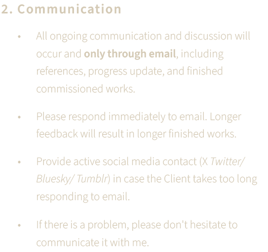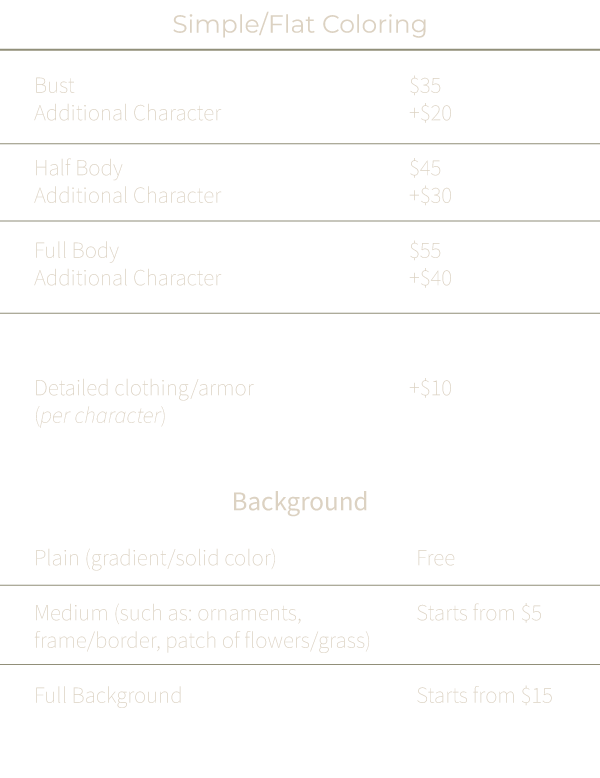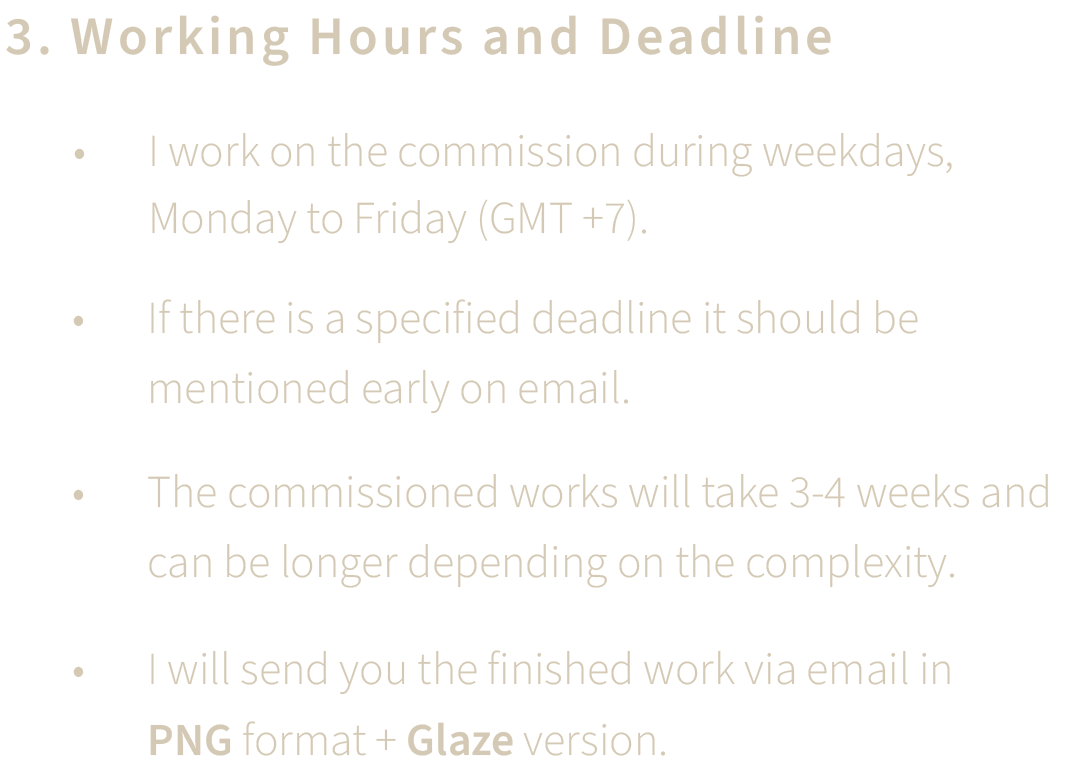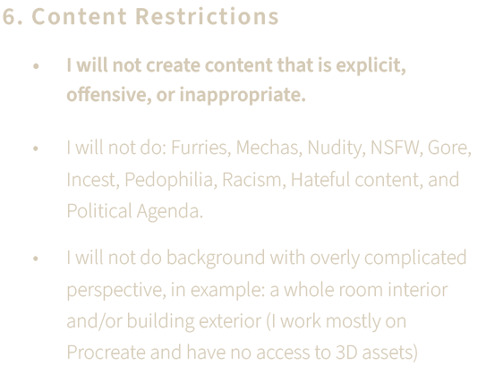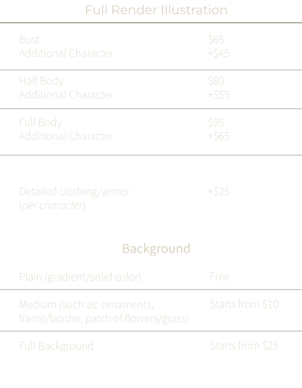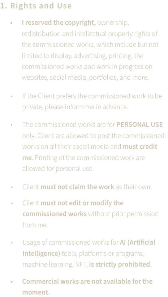 By commissioning me, the Client agrees to the following terms, please read carefully. Any Works that violated these terms will be canceled immediately. I have the right to decline any commission that I don’t feel comfortable or capable to work on.